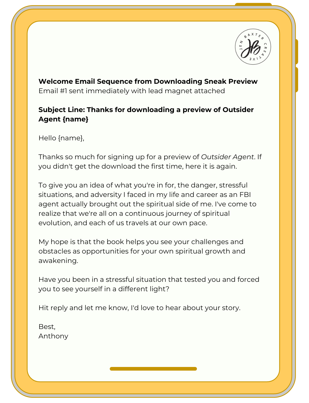 His main message In this action packed memoir was about seeing obstacles as opportunities in life. So with a short email sequence that delivered the first chapter, I used a different life experience in each email and ended with a question to engage the reader. After the book launched the sequence was updated to include a call to action in the P.S. to buy the book on Amazon or leave an Amazon review.