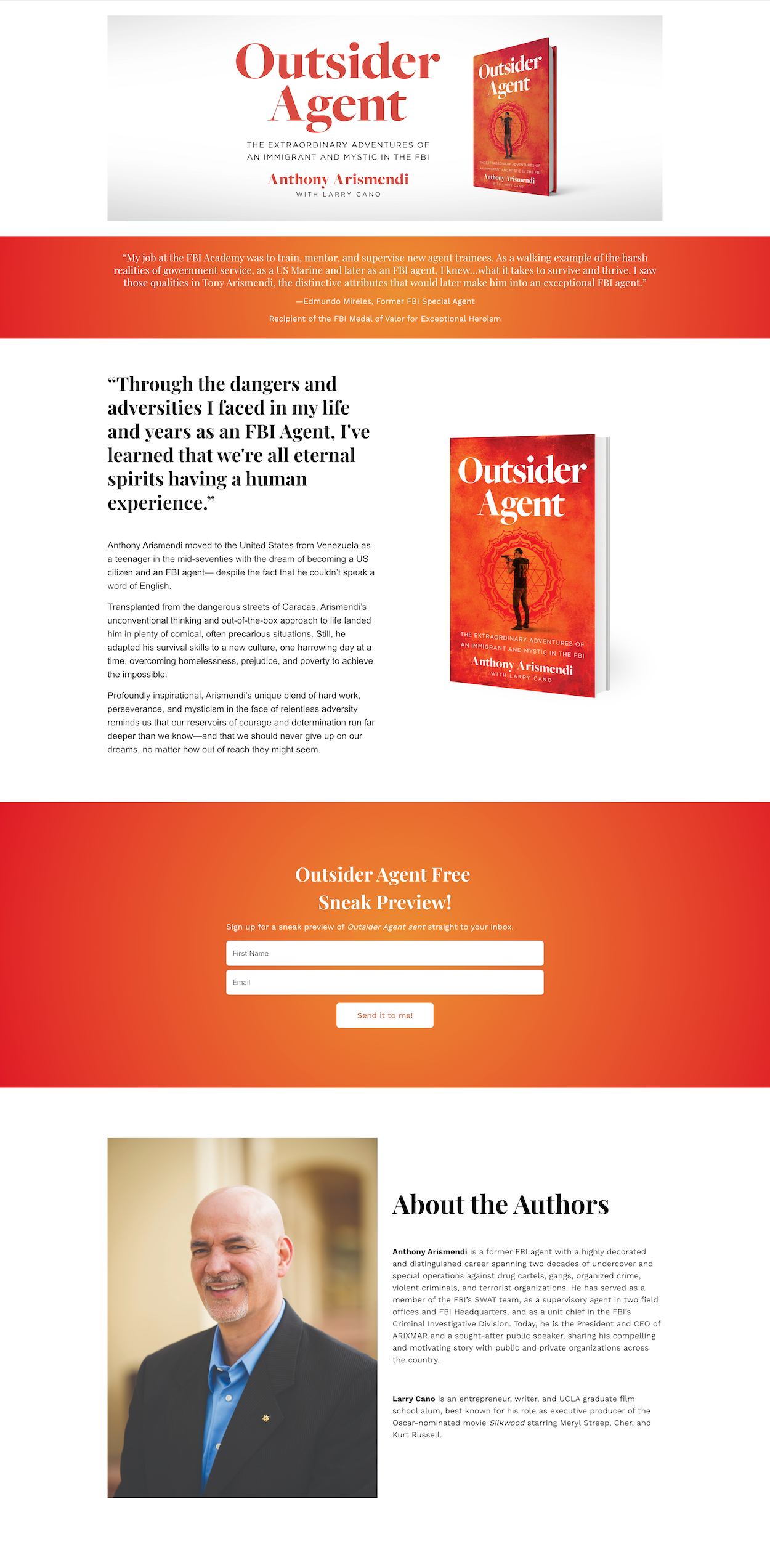 When Anthony was finishing his memoir, Outsider Agent, he needed to start building an email list from scratch. So before his website and book launch date, I set him up on MailerLite and wrote a landing page to share on social media. We used the first chapter as a lead magnet and called it a “Sneak Peak” to start building book launch momentum.