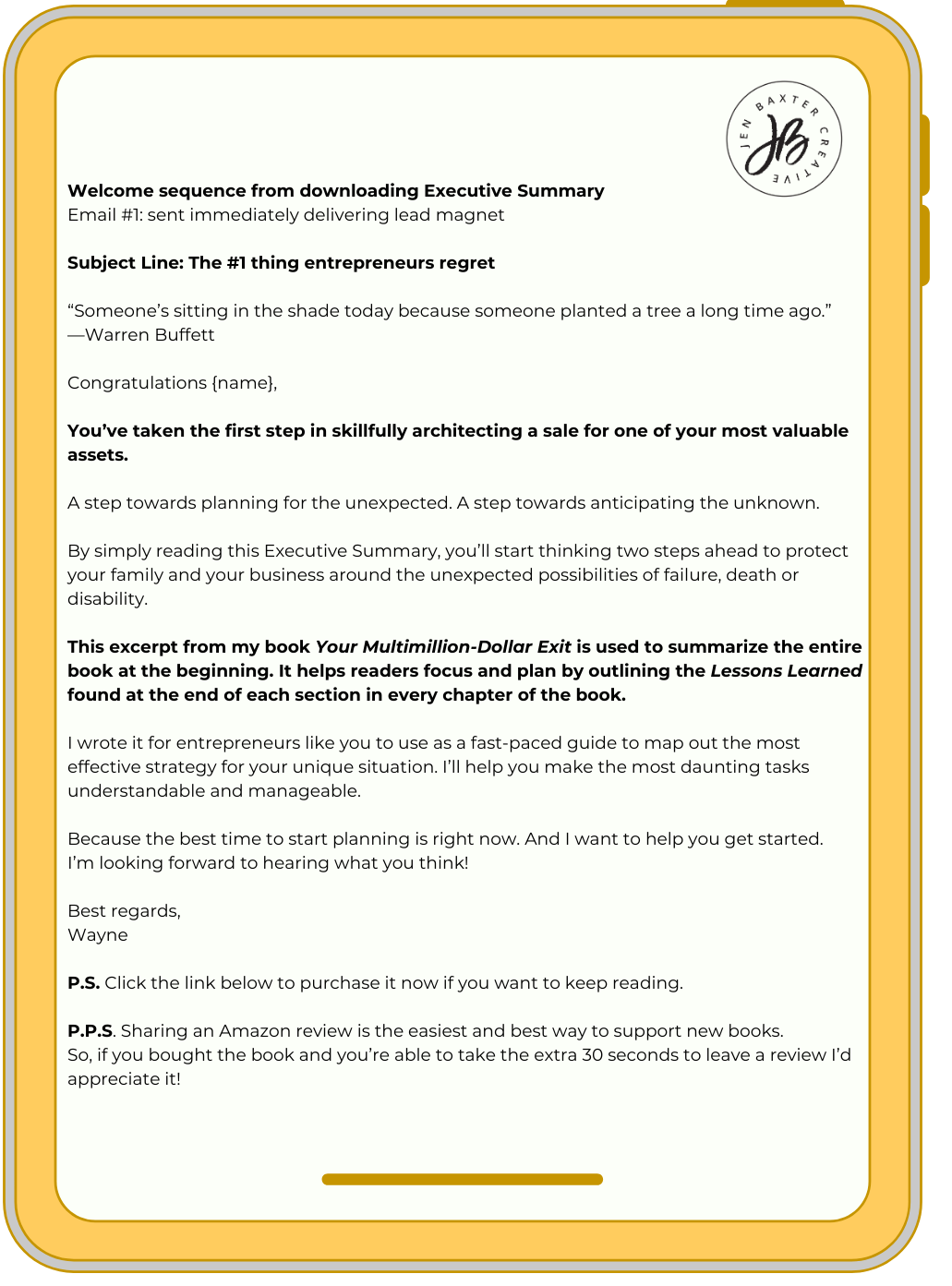 The book included an executive summary that gives busy entrepreneurs a fast-paced guide of all the information in the book. We decided to use that as a lead magnet for the sequence.