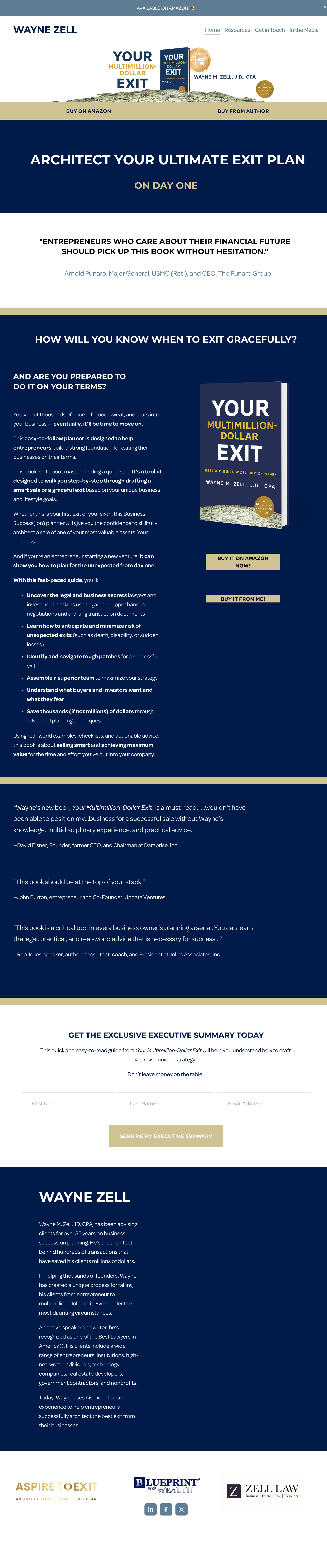 Wayne leveraged his law firm email list to a hungry audience excited for his book, Your Multi-Million Dollar Exit. Zell Law had its own marketing team that was already set up on Mailchimp. Ultimately, they used my landing page copy for the book page on the firm's existing website. He wanted copy that had professional polish and reflected more of Wayne’s voice as an author, slightly separating him from his established law firm brand.